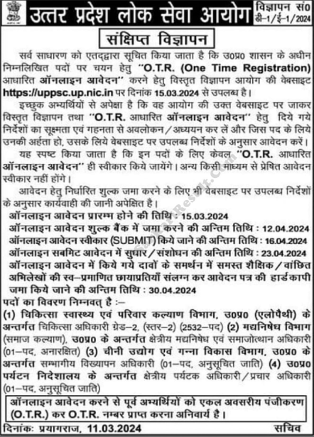 | Uttar Pradesh Public Service Commission (UPPSC) has invited Online Application Form for the post of Medical Officer Allopathy Divisional Publication Officer Regional Prohibition and Social Development Officer & more posts.. There are total 2535 vacancies for this recruitment. You can check here important details such as- last date, exam date and admit card date for Uppsc medical officer (mo) online form 24: apply for 2535 vacancies online 2025-2026 in simple steps. Application started from date 15/Mar/2024. Last date to fill this form is - 12/Apr/2024 so fill your form before 12/Apr/2024. Monthly PayScale(Salary) for this job will be -As per department rule₹. Age Limit for this post is - 21-40. Read instructions carefully to apply online for Medical Officer Allopathy Divisional Publication Officer Regional Prohibition and Social Development Officer & more posts. Application Form. If you are interested in this job you can get important details below Like- Eligibility, Form Fee, Salary etc. If you have any query related to this job, please ask in comment section. Job Location - Uttar Pradesh |