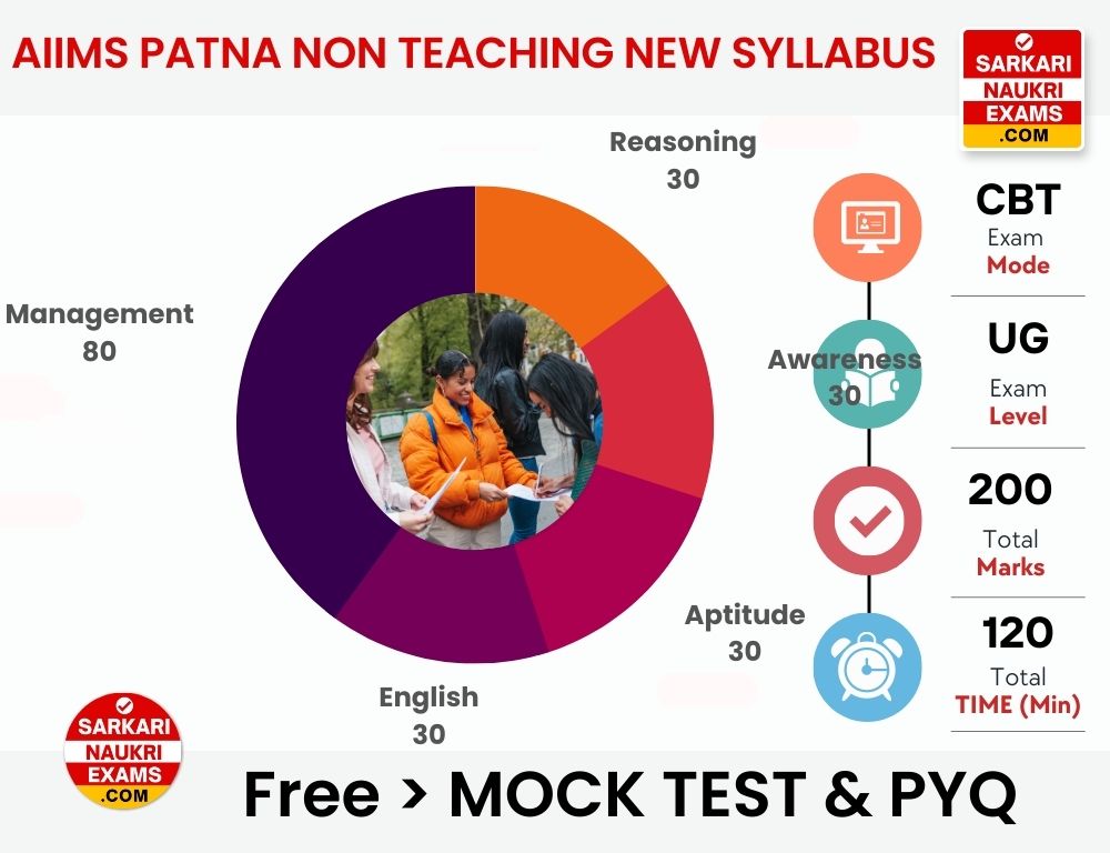 AIIMS Patna conducts a written exam for Non-Teaching positions. AIIMS Patna Non-Teaching Syllabus 2026 exam is online (CBT) and at the graduate level. It consists of 200 objective-type questions in Hindi & English, with a total of 200 marks. Candidates have 60 minutes to complete the exam. Subjects include General Intelligence & Reasoning, General Awareness, Quantitative Aptitude, English Comprehension, and Material Management. Each correct answer is awarded 1 mark.