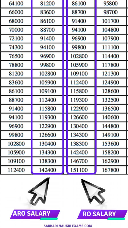 ARO Salary: Pay Level 07, Pay Band PB-2 (9300 to 34800), Pay Scale Rs. 44,900/- to Rs. 1,42,400/- with Grade Pay 4600. The Basic Salary is Rs. 44,900/- and the Maximum Salary is Rs. 1,42,400/-. The Dearness Allowance (DA) is Rs. 17,062/- (38% of Basic Pay) and the House Rent Allowance (HRA) ranges from Rs. 4,000/- to Rs. 7,000/-. The Transport Allowance (TA) ranges from Rs. 3,000/- to Rs. 5,000/-.