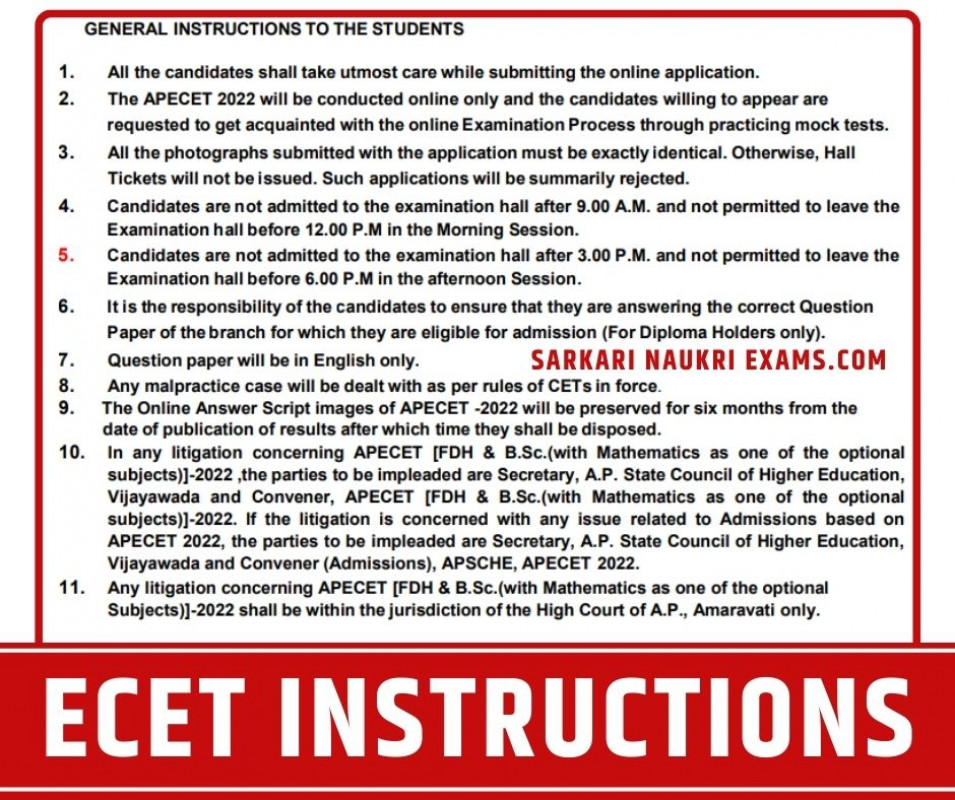 - Candidates should not enter the examination hall after 9 am. And you are not allowed to leave the examination room before 12:00 PM in the morning session with a hard copy of the AP ECET Hall Ticket.