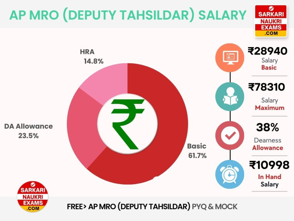 AP MRO (Deputy Tahsildar) Salary 2026 (ఆంధ్ర ప్రదేశ్ మండల అధికారి జీతం): The salary of an Andhra Pradesh Mandal Revenue Officer (MRO) is in the range of ₹28,940 to ₹78,310 according to experience and position. The in-hand starting salary is around ₹19,337 per month. In addition to the basic pay, MROs receive several allowances according to the AP government's Grade Pay rules. In terms of career progression, promotions are granted based on performance, seniority, and skill.