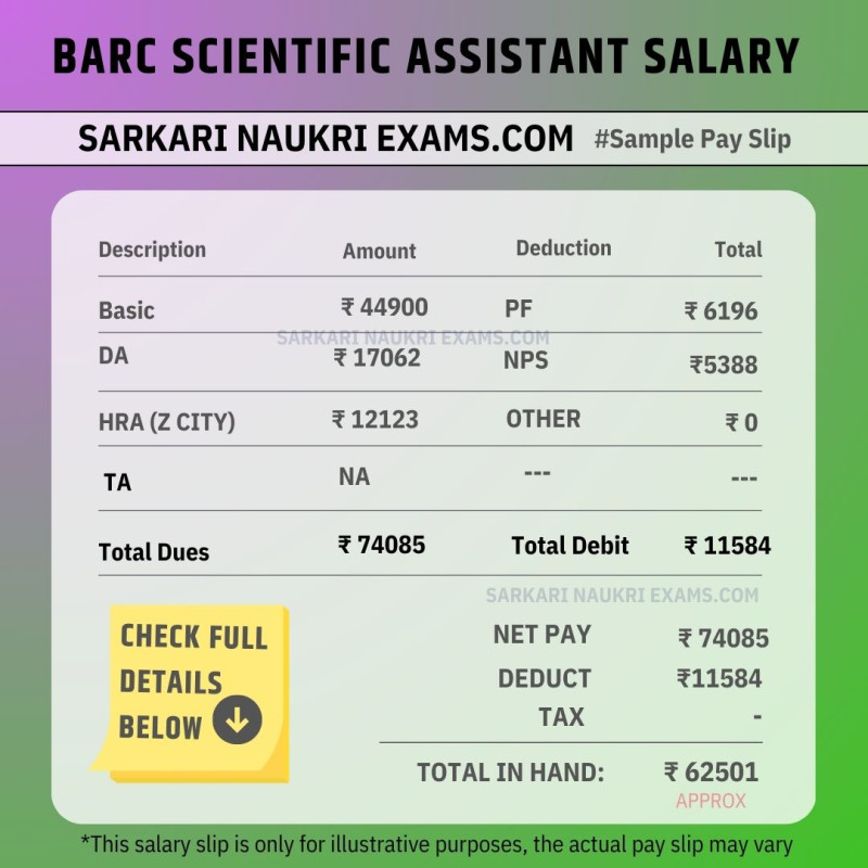 After the successful completion of training, the Stipendiary Trainees category (1) will be considered for the appointment of Scientific Assistant/C (Group 'B' Non-Gazetted) depending on their performance during the period of training. BARC Scientific Assistant Salary level is 7. Therefore the monthly salary of a BARC Scientific Assistant will be Rs.44900/-.