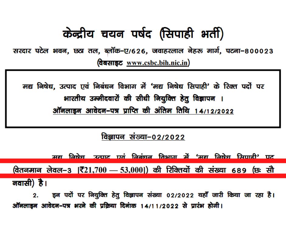 | Bihar Police Prohibition Pay Scale | Rs.21,700 – 53,000/- |