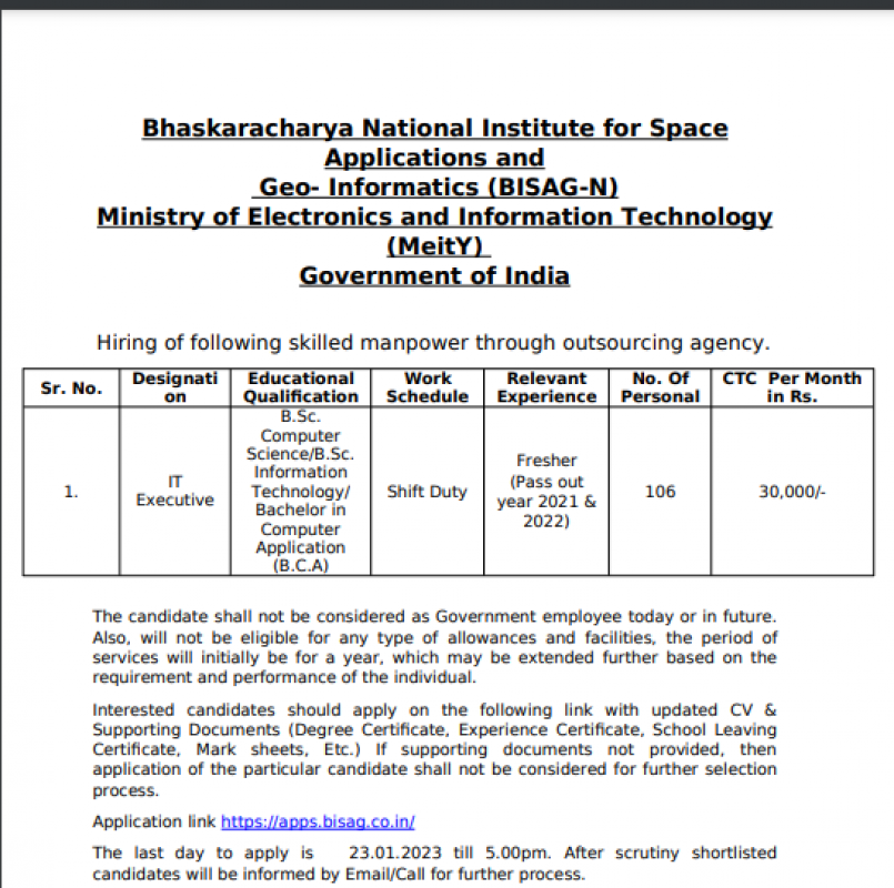 | : Bhaskaracharya National Institute for Space Applications and G eo-informatics (BISAG-N) has invited Online Application Form for the post of IT Executive. There are total 106 vacancies for this recruitment. Check details like- last date, exam date and admit card date for Bisag-n it executive recruitment 23 | 106 vacancy recruitment 2026-2027. Application started from date 09/Jan/2023. Last date to fill this form is - 23/Jan/2023 so fill your form before 23/Jan/2023. Monthly PayScale(Salary) for this job will be -As per department rule₹. You can download this job detail by saving as pdf on your mobile/laptop device for future reference. Read instructions carefully to apply online for IT Executive Application Form. If you are interested in this job you can get important details below Like- Eligibility, Form Fee, Salary etc. If you have any query related to this job, please ask in comment section. : Bhaskaracharya National Institute for Space Applications and G eo-informatics (BISAG-N) ने IT Executive के पद के लिए ऑनलाइन आवेदन पत्र आमंत्रित किया है। इस भर्ती के लिए कुल 106 रिक्तियां हैं। आप यहां महत्वपूर्ण विवरण जैसे कि अंतिम तिथि, IT Executive ऑनलाइन फॉर्म के लिए महत्वपूर्ण तारीख देख सकते हैं। इस भर्ती के फॉर्म की शुरू होने की तारीख 09/Jan/2023 है। इस फॉर्म को भरने की अंतिम तिथि है- 23/Jan/2023 तो 23/Jan/2023 से पहले अपना फॉर्म जरूर भरे। मासिक पेस्केल (वेतन) इस नौकरी के लिए As per department rule ₹ होगा। IT Executive के लिए ऑनलाइन आवेदन करने के लिए सावधानीपूर्वक सभी निर्देश पढ़ें। यदि आप इस नौकरी में रुचि रखते हैं तो आप कृपया अहम् जानकारी जैसे योग्यता, फॉर्म शुल्क, वेतन आदि चेक करना मत भूले। यदि आपके पास इस नौकरी से संबंधित कोई प्रश्न है तो नीचे दिए गए कमेंट बॉक्स में पूछे! हमारी टीम आपकी पूरी मदद करेगी। Job Location - All India |