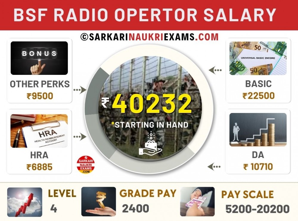 The Starting BSF Head Constable (HCM) and Radio Operator (RO) Basic Pay is ₹25500/- to ₹81100/- per month. The BSF HC RO Grade Pay is ₹2400, and it's a Grade A job that comes under Level 04. The BSF Head Constable RO and RM Salary comes under Pay Band 3, i.e.PB-1(9300-34800).