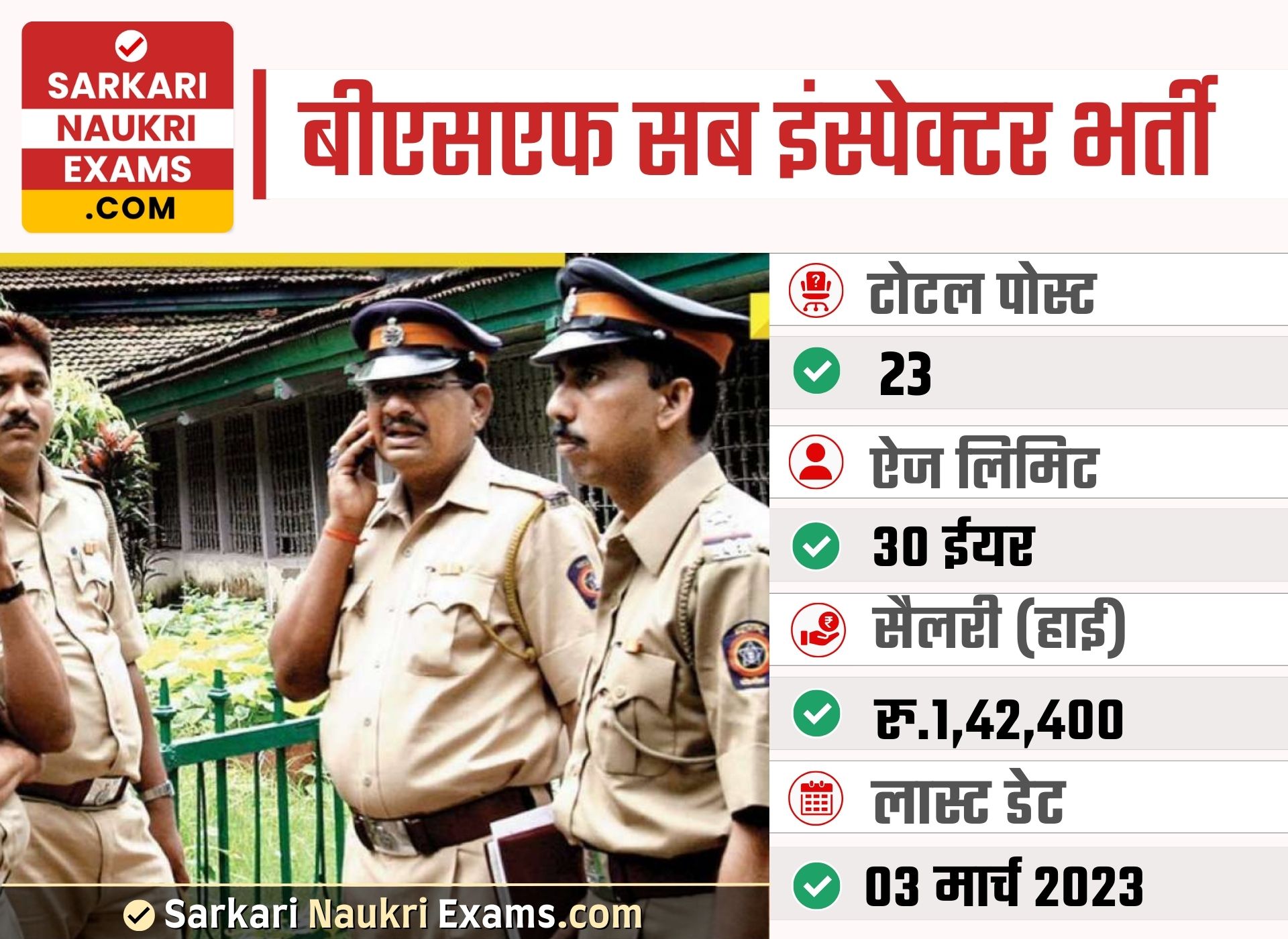 There are total 23 vacancies for this post notification. Min Pay Scale Monthly for this post is Rs.(35,400). Pay Scale for this vacancy is Rs.(35,400-1,42,400). Max Pay Scale Monthly Rs.(1,42,400). Selection for this job will be based on Written Exam. If you want to apply online for this vacancy(bharti), visit website - Click Here. You can download notification from Here. If you want other details such as admit card, answer key & result for 2024 year, visit official website http://bsf.nic.in/. For Latest Sarkari Result, Sarkari Exam & sarkariresult Updates keep visiting www.sarkarinaukriexams.com.