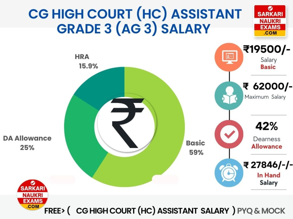 The CG High Court (HC) Assistant Grade 3 (AG 3) Salary 2025 is under Pay Level 4 in Pay Band PB 2 (Rs 5200-20200) with a Grade Pay of Rs 3900. The basic salary ranges from Rs 19,500 to Rs 62,000. Employees receive a Dearness Allowance (DA) of 53% of Basic Pay and a House Rent Allowance (HRA) of 20% of Basic Pay, along with a Transport Allowance (TA) as per norms.