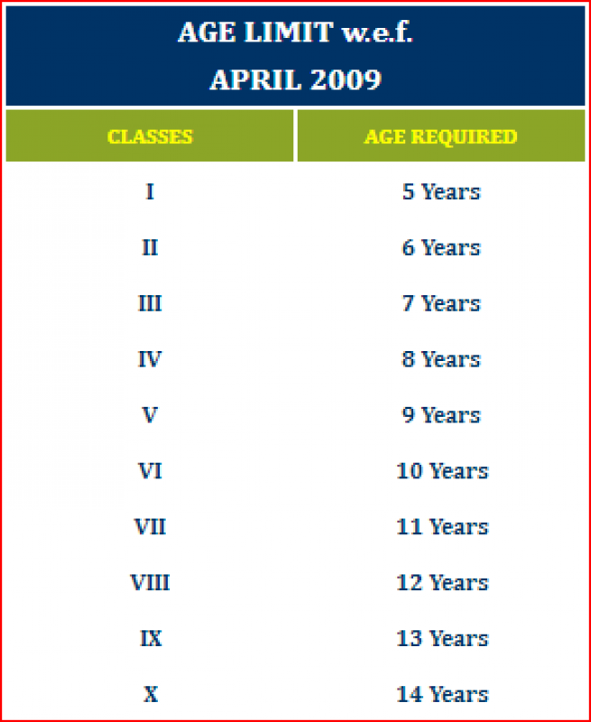 Age Limit:- The child's age for admission should be as per the table given below:-