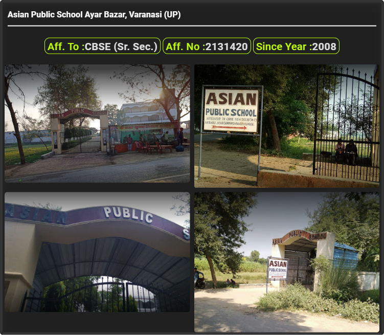 Asian Public School Ayar Bazar, Varanasi (UP), was established in 2008. Asian Public School Ayar Bazar, Varanasi (UP), is up to class Asian Public School Ayar Bazar, Varanasi (UP). Asian Public School Ayar Bazar, Varanasi (UP) is a CBSE (Sr. Sec.) Board school in Ayar Bazar, Varanasi District. Affilation no of this school is 2131420. Currently, Prem Shankar Singh is the Head/Principal of Asian Public School Ayar Bazar, Varanasi (UP).This school has courses Class 1st (I), Class 2nd(II), Class 3rd (III), Class 4th (IV), Class 5th (V), Class 6th (VI), Class 7th (VII), Class 8th (VIII), Class 9th (IX), Class 10th (X), Class 11th (XI) & Class 12th (XII). Check details of Asian Public School Ayar Bazar, Varanasi (UP) Admission Form 2022-23, Contact Number (E-Mail/Phone Number), Fee Structure, and Latest Official Notice.