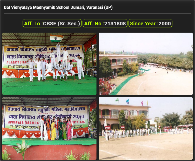 Bal Vidhyalaya Madhyamik School Dumari, Varanasi (UP), was established in 2000. Bal Vidhyalaya Madhyamik School Dumari, Varanasi (UP), is up to class Bal Vidhyalaya Madhyamik School Dumari, Varanasi (UP). Bal Vidhyalaya Madhyamik School Dumari, Varanasi (UP) is a CBSE (Sr. Sec.) Board school in Dumari, Varanasi District. Affiliation no of this school is 2131808. Currently, Aparna Pandey is the Head/Principal of Bal Vidhyalaya Madhyamik School Dumari, Varanasi (UP).This school has courses Nursery, Class 1st (I), Class 2nd(II), Class 3rd (III), Class 4th (IV), Class 5th (V), Class 6th (VI), Class 7th (VII), Class 8th (VIII), Class 9th (IX), Class 10th (X), Class 11th (XI) & Class 12th (XII). Check details of Bal Vidhyalaya Madhyamik School Dumari, Varanasi (UP) Admission Form 2022-23, Contact Number (E-Mail/Phone Number), Fee Structure, and Latest Official Notice.