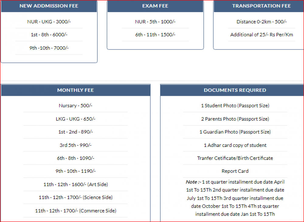 Get fee details about admission, Tuition fee and transort fee and other fee details.
