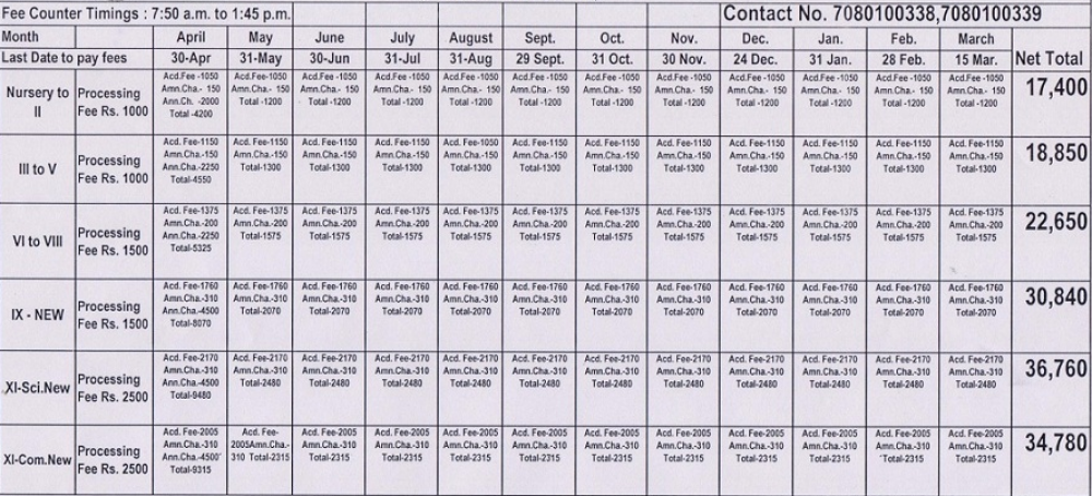 Get fee details about admission, Tuition fee and transort fee and other fee details.