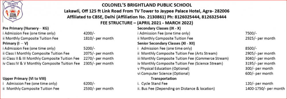 Colonel's Brightland Public School, Agra (कोलोनिल ब्रेटलैंड पब्लिक स्कूल), was established in 2004 Colonel's Brightland Public School, is an English Medium Co-ed, Education Day School, Agra, is up to class Colonel's Brightland Public School, is an English Medium Co-ed, Education Day School, Agra. Colonel's Brightland Public School, Lakawali, PO- Kalal Kheria, Agra-01 In Uttar Pradesh is a CBSE {Senior Secondary} Board school in Lakawali, PO- Kalal Kheria, Agra District. The affiliation no of this school is 2130861. Currently, Rubina Khanam {रुबीना खानम} is the Head/Principal of Colonel's Brightland Public School, Lakawali, PO- Kalal Kheria, Agra-01 In Uttar Pradesh. This school has courses Nur. & LKG, Class I, Class II, Class III, Class IV, Class V, Class VI, Class VII, Class VIII, Class IX, Class X, Class XI & XII. Check details of Colonel's Brightland Public School, Agra (कोलोनिल ब्रेटलैंड पब्लिक स्कूल) Admission Form -(Based on Previous Year), Contact Number (E-Mail/Phone Number), Fee Structure, and Latest Official Notice.