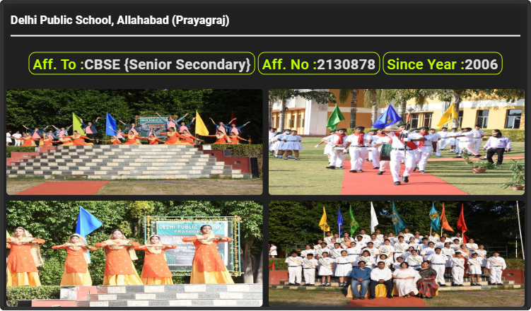 Delhi Public School, Allahabad (Prayagraj), दिल्ली पब्लिक स्कूल, इलाहाबाद (प्रयागराज) , was established in 2006 DPS, Allahabad , is up to class DPS, Allahabad . Delhi Public School, is an English Medium Co-ed Sr. Sec. School, Allahabad is a CBSE (Senior Secondary} Board school in Naini, Allahabad District. Affilication no of this school is 2130878. Currently, Sujata Singh {सुजाता सिंह} is the Head/Principal of Delhi Public School, is an English Medium Co-ed Sr. Sec. School, Allahabad .This school has courses Nur. & LKG, Class I, Class II, Class III, Class IV, Class V, Class VI, Class VII, Class VIII, Class IX, Class X, Class XI, Class XII, . Check details of Delhi Public School, Allahabad (Prayagraj), दिल्ली पब्लिक स्कूल, इलाहाबाद (प्रयागराज) Admission Form -(Based on Previous Year), Contact Number (E-Mail/Phone Number), Fee Structure, and Latest Official Notice.