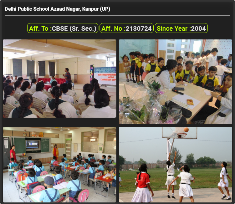 Delhi Public School Azaad Nagar, Kanpur (UP), was established in 2004. Delhi Public School Azaad Nagar, Kanpur (UP), is up to class Delhi Public School Azaad Nagar, Kanpur (UP). Delhi Public School Azaad Nagar, Kanpur (UP) is a CBSE (Sr. Sec.) Board school in Mainawati Marg, Azad Nagar, Kanpur Nagar District. Affilication no of this school is 2130724. Currently, Mrs. Punita Kapoor is the Head/Principal of Delhi Public School Azaad Nagar, Kanpur (UP).This school has courses Kindergarten (KG), Lower Kindergarten (LKG), Upper Kindergarten (UKG), Class 1st (I), Class 2nd(II), Class 3rd (III), Class 4th (IV), Class 5th (V), Class 6th (VI), Class 7th (VII), Class 8th (VIII), Class 9th (IX), Class 10th (X), Class 11th (XI) & Class 12th (XII). Check details of Delhi Public School Azaad Nagar, Kanpur (UP) Admission Form 2020, Contact Number (E-Mail/Phone Number), Fee Structure, and Latest Official Notice.