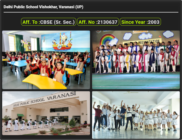 Delhi Public School {DPS} Vishokhar, Varanasi (UP), was established in 2003. Delhi Public School {DPS} Vishokhar, Varanasi (UP), is up to class Delhi Public School {DPS} Vishokhar, Varanasi (UP). Delhi Public School {DPS} Vishokhar, Varanasi (UP) is a CBSE (Sr. Sec.) Board school in Chandauli (Mohansarai By-Pass Road), Varanasi District. Affiliation no of this school is 2130637. Currently, Mr. Mukesh Shelat is the Head/Principal of Delhi Public School {DPS} Vishokhar, Varanasi (UP).This school has courses Class Prep, Nursery, Kindergarten (KG), Class 1st (I), Class 2nd(II), Class 3rd (III), Class 4th (IV), Class 5th (V), Class 6th (VI), Class 7th (VII), Class 8th (VIII), Class 9th (IX), Class 10th (X), Class 11th (XI) & 12th (XII). Check details of Delhi Public School {DPS} Vishokhar, Varanasi (UP) Admission Form 2022-23, Contact Number (E-Mail/Phone Number), Fee Structure, and Latest Official Notice.