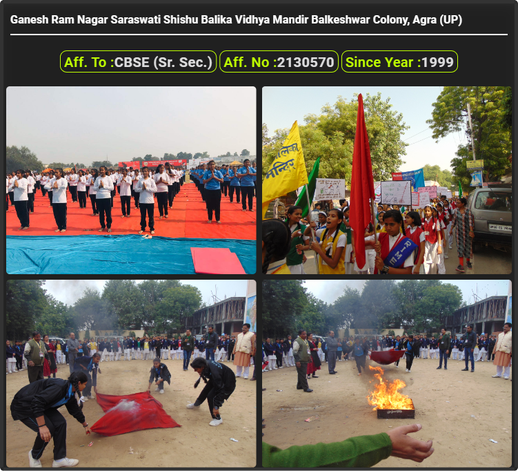 Ganesh Ram Nagar Saraswati Shishu Balika Vidhya Mandir Balkeshwar Colony, Agra (UP), was established in 1999. Ganesh Ram Nagar Saraswati Shishu Balika Vidhya Mandir Balkeshwar Colony, Agra (UP), is up to class Ganesh Ram Nagar Saraswati Shishu Balika Vidhya Mandir Balkeshwar Colony, Agra (UP). Ganesh Ram Nagar Saraswati Shishu Balika Vidhya Mandir Balkeshwar Colony, Agra (UP) is a CBSE (Sr. Sec.) Board school in Balkeshwar, Agra District. Affilication no of this school is 2130570. Currently, Mrs. Charul Patel is the Head/Principal of Ganesh Ram Nagar Saraswati Shishu Balika Vidhya Mandir Balkeshwar Colony, Agra (UP).This school has courses Class 1st (I), Class 2nd(II), Class 3rd (III), Class 4th (IV), Class 5th (V), Class 6th (VI), Class 7th (VII), Class 8th (VIII), Class 9th (IX), Class 10th (X), Class 11th (XI), & Class 12th (XII). Check details of Ganesh Ram Nagar Saraswati Shishu Balika Vidhya Mandir Balkeshwar Colony, Agra (UP) Admission Form 2020, Contact Number (E-Mail/Phone Number), Fee Structure, and Latest Official Notice.