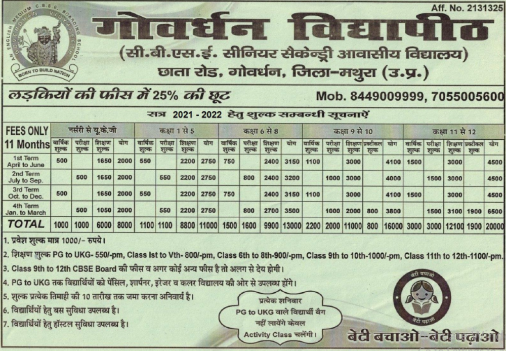 {Goverdhan Vidyapeeth Om Nagar Padal Goverdhan, Mathura Fee Structure -(Based on Previous Year)}