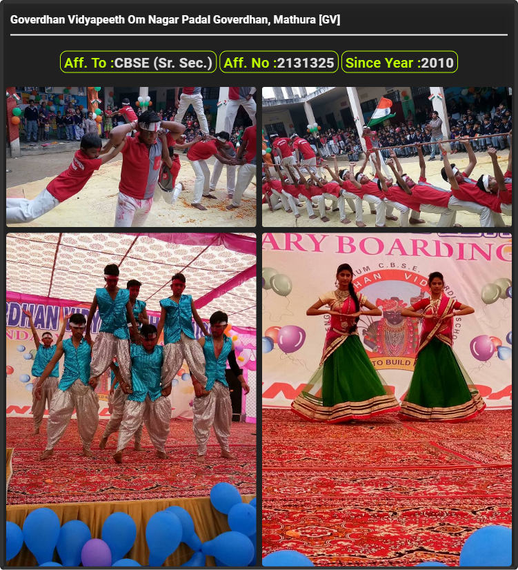 Goverdhan Vidyapeeth Om Nagar Padal Goverdhan, Mathura [GV], was established in 2010 Goverdhan Vidyapeeth Om Nagar Padal Goverdhan, Mathura [GV], is up to class Goverdhan Vidyapeeth Om Nagar Padal Goverdhan, Mathura [GV]. Goverdhan Vidyapeeth Om Nagar Padal Goverdhan, Mathura [GV] is a CBSE (Sr. Sec.) Board school in Om Nagar Padal Goverdhan, Mathura District. Affiliation no of this school is 2131325. Currently, Radhika Gautam is the Head/Principal of Goverdhan Vidyapeeth Om Nagar Padal Goverdhan, Mathura [GV].This school has courses Class Pre Nursery, Class Nursery, Kindergarten (KG), Class LKG, Class UKG, Class 1st (I), Class 2nd(II), Class 3rd (III), Class 4th (IV), Class 5th (V), Class 6th (VI), Class 7th (VII), Class 8th (VIII), Class 9th (IX), Class 10th (X), Class 11th (XI): Science & Class 12th (XII): Science. Check details of Goverdhan Vidyapeeth Om Nagar Padal Goverdhan, Mathura [GV] Admission Form -(Based on Previous Year), Contact Number (E-Mail/Phone Number), Fee Structure, and Latest Official Notice.