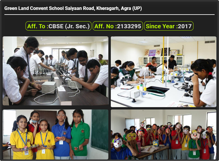 Green Land Convent School Saiyaan Road, Kheragarh, Agra (UP), was established in 2017. Green Land Convent School Saiyaan Road, Kheragarh, Agra (UP), is up to class Green Land Convent School Saiyaan Road, Kheragarh, Agra (UP). Green Land Convent School Saiyaan Road, Kheragarh, Agra (UP) is a CBSE (Jr. Sec.) Board school in Kheragarh, Agra District. Affilication no of this school is 2133295. Currently, Mr. Ashwani Kumar Daniel is the Head/Principal of Green Land Convent School Saiyaan Road, Kheragarh, Agra (UP).This school has courses Class 1st (I), Class 2nd(II), Class 3rd (III), Class 4th (IV), Class 5th (V), Class 6th (VI), Class 7th (VII), Class 8th (VIII), Class 9th (IX), & Class 10th (X). Check details of Green Land Convent School Saiyaan Road, Kheragarh, Agra (UP) Admission Form 2020, Contact Number (E-Mail/Phone Number), Fee Structure, and Latest Official Notice.