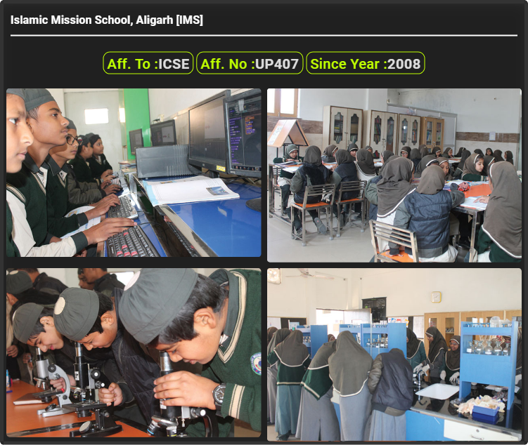 Islamic Mission School, Aligarh [IMS], was established in 2008 Islamic Mission School, Aligarh [IMS], is up to class Islamic Mission School, Aligarh [IMS]. Islamic Mission School, Aligarh [IMS] is a ICSE Board school in Fort Green City, Near A.M.U. Fort, Aligarh District. Affiliation no of this school is UP407. Currently, Ms. Shaista Mateen is the Head/Principal of Islamic Mission School, Aligarh [IMS].This school has courses Nursery & K.G., Class I, Class II, Class III, Class IV, Class V, Class VI, Class VII, Class VIII, Class IX, Class X, . Check details of Islamic Mission School, Aligarh [IMS] Admission Form 2022-23, Contact Number (E-Mail/Phone Number), Fee Structure, and Latest Official Notice.