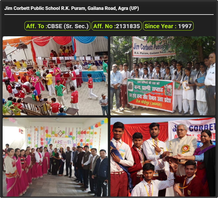 Jim Corbett Public School R.K. Puram, Gailana Road, Agra (UP), was established in 1997. Jim Corbett Public School R.K. Puram, Gailana Road, Agra (UP), is up to class Jim Corbett Public School R.K. Puram, Gailana Road, Agra (UP). Jim Corbett Public School R.K. Puram, Gailana Road, Agra (UP) is a CBSE (Sr. Sec.) Board school in R.K. Puram, Gailana Road, Agra District. Affilication no of this school is 2131835. Currently, Mrs. krishana singh is the Head/Principal of Jim Corbett Public School R.K. Puram, Gailana Road, Agra (UP).This school has courses Nursery, Lower Kindergarten (LKG), Upper Kindergarten (UKG), Class 1st (I), Class 2nd(II), Class 3rd (III), Class 4th (IV), Class 5th (V), Class 6th (VI), Class 7th (VII), Class 8th (VIII), Class 9th (IX), Class 10th (X), Class 11th (XI), & Class 12th (XII). Check details of Jim Corbett Public School R.K. Puram, Gailana Road, Agra (UP) Admission Form 2020, Contact Number (E-Mail/Phone Number), Fee Structure, and Latest Official Notice.