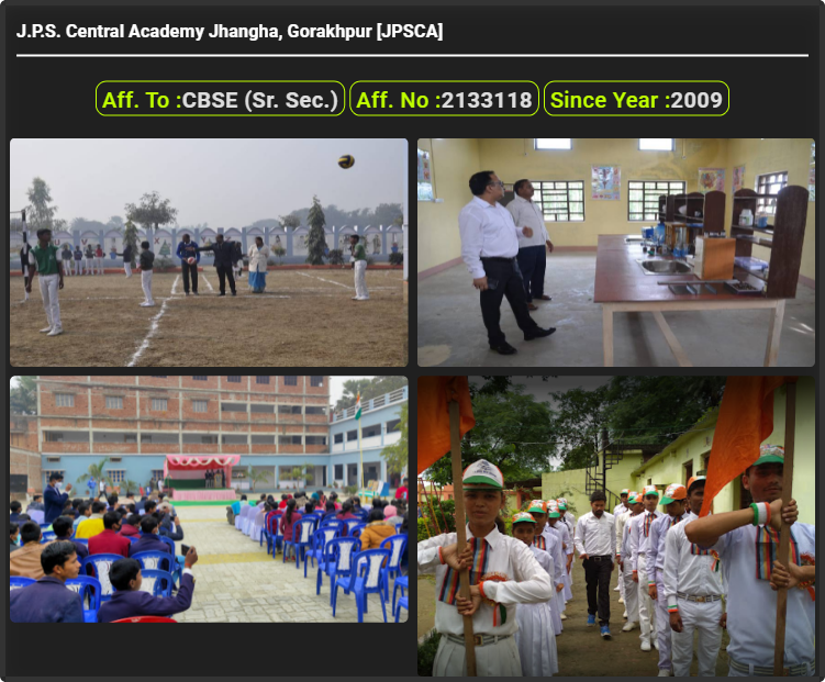 J.P.S. Central Academy Jhangha, Gorakhpur [JPSCA], was established in 2009 J.P.S. Central Academy Jhangha, Gorakhpur [JPSCA], is up to class J.P.S. Central Academy Jhangha, Gorakhpur [JPSCA]. J.P.S. Central Academy Jhangha, Gorakhpur [JPSCA] is a CBSE (Sr. Sec.) Board school in Jhangha, Gorakhpur District. Affiliation no of this school is 2133118. Currently, Mr. Abhijeet Kumar is the Head/Principal of J.P.S. Central Academy Jhangha, Gorakhpur [JPSCA].This school has courses Class LKG, Class UKG, Class 1st (I), Class 2nd(II), Class 3rd (III), Class 4th (IV), Class 5th (V), Class 6th (VI), Class 7th (VII), Class 8th (VIII), Class 9th (IX), Class 10th (X), Class 11th (XI) & Class 12th (XII). Check details of J.P.S. Central Academy Jhangha, Gorakhpur [JPSCA] Admission Form 2022-23, Contact Number (E-Mail/Phone Number), Fee Structure, and Latest Official Notice.