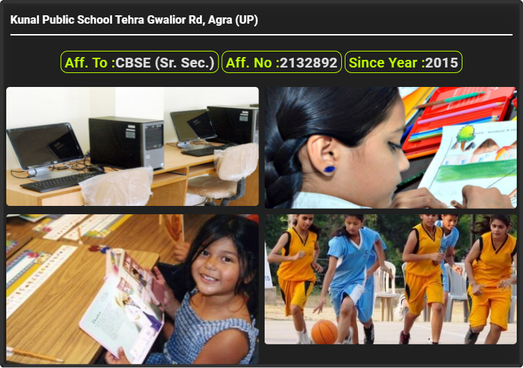 Kunal Public School Tehra Gwalior Rd, Agra (UP), was established in 2015. Kunal Public School Tehra Gwalior Rd, Agra (UP), is up to class Kunal Public School Tehra Gwalior Rd, Agra (UP). Kunal Public School Tehra Gwalior Rd, Agra (UP) is a CBSE (Sr. Sec.) Board school in Tehra, Gwalior Road, Agra District. Affilication no of this school is 2132892. Currently, Mr. Devendra Tyagi is the Head/Principal of Kunal Public School Tehra Gwalior Rd, Agra (UP).This school has courses Lower Kindergarten (LKG), Upper Kindergarten (UKG), Class 1st (I), Class 2nd(II), Class 3rd (III), Class 4th (IV), Class 5th (V), Class 6th (VI), Class 7th (VII), Class 8th (VIII), Class 9th (IX), Class 10th (X), Class 11th (XI) & Class 12th (XII). Check details of Kunal Public School Tehra Gwalior Rd, Agra (UP) Admission Form 2020, Contact Number (E-Mail/Phone Number), Fee Structure, and Latest Official Notice.