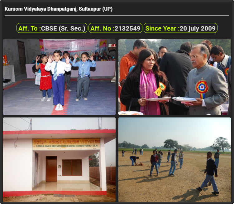 Kuruom Vidyalaya Dhanpatganj, Sultanpur (UP), was established in 20 july 2009. Kuruom Vidyalaya Dhanpatganj, Sultanpur (UP), is up to class Kuruom Vidyalaya Dhanpatganj, Sultanpur (UP). Kuruom Vidyalaya Dhanpatganj, Sultanpur (UP) is a CBSE (Sr. Sec.) Board school in Dhanpatganj, Sultanpur District. Affilication no of this school is 2132549. Currently, Mrs. Shagufa Afzal is the Head/Principal of Kuruom Vidyalaya Dhanpatganj, Sultanpur (UP).This school has courses Kindergarten (KG), Class 1st (I), Class 2nd(II), Class 3rd (III), Class 4th (IV), Class 5th (V), Class 6th (VI), Class 7th (VII), Class 8th (VIII), Class 9th (IX), Class 10th (X), Class 11th (XI) & Class 12th (XII). Check details of Kuruom Vidyalaya Dhanpatganj, Sultanpur (UP) Admission Form 2020, Contact Number (E-Mail/Phone Number), Fee Structure, and Latest Official Notice.