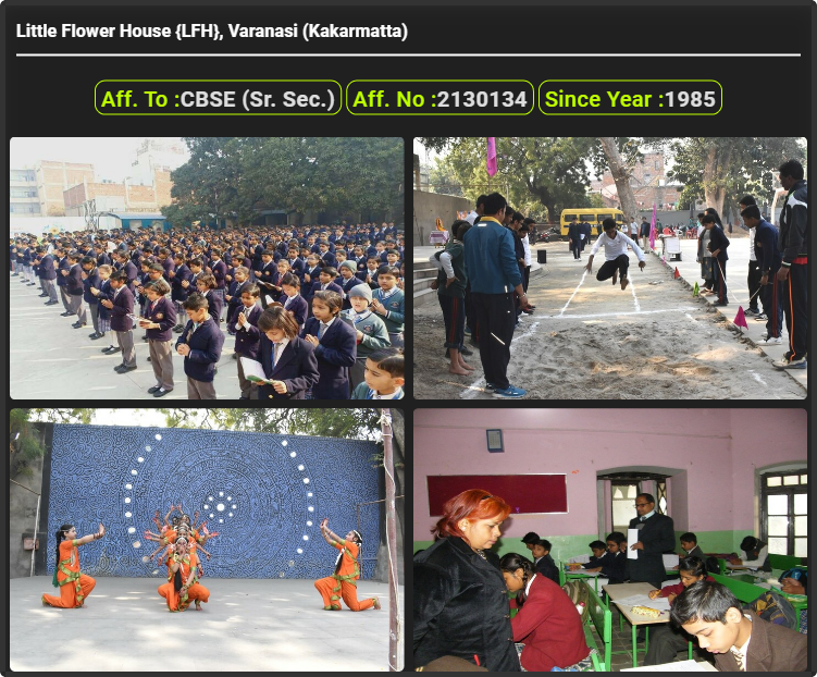Little Flower House {LFH}, Varanasi (Kakarmatta), was established in 1985. Little Flower House {LFH}, Varanasi (Kakarmatta), is up to class Little Flower House {LFH}, Varanasi (Kakarmatta). Little Flower House {LFH}, Varanasi (Kakarmatta) is a CBSE (Sr. Sec.) Board school in Kakarmatta, Varanasi District. Affiliation no of this school is 2130134. Currently, Mrs. Indu Gulati is the Head/Principal of Little Flower House {LFH}, Varanasi (Kakarmatta).This school has courses Class Prep-I & II, Class PG & Nursery, Class 1st (I), Class 2nd(II), Class 3rd (III), Class 4th (IV), Class 5th (V), Class 6th (VI), Class 7th (VII), Class 8th (VIII), Class 9th (IX), Class 10th (X), Class 11th (XI) & 12th (XII). Check details of Little Flower House {LFH}, Varanasi (Kakarmatta) Admission Form 2022-23, Contact Number (E-Mail/Phone Number), Fee Structure, and Latest Official Notice.