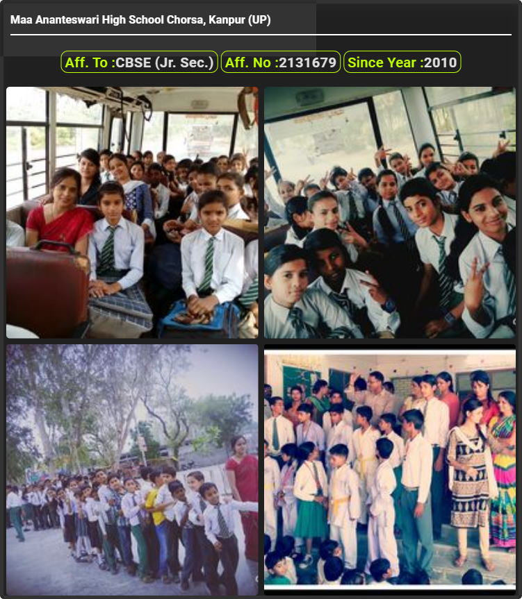 Maa Ananteswari High School Chorsa, Kanpur (UP), was established in 2010. Maa Ananteswari High School Chorsa, Kanpur (UP), is up to class Maa Ananteswari High School Chorsa, Kanpur (UP). Maa Ananteswari High School Chorsa, Kanpur (UP) is a CBSE (Jr. Sec.) Board school in Chorsa, Kanpur Nagar District. Affilication no of this school is 2131679. Currently, Padmakant Srivastava is the Head/Principal of Maa Ananteswari High School Chorsa, Kanpur (UP).This school has courses Class 1st (I), Class 2nd(II), Class 3rd (III), Class 4th (IV), Class 5th (V), Class 6th (VI), Class 7th (VII), Class 8th (VIII), Class 9th (IX), Class 10th (X). Check details of Maa Ananteswari High School Chorsa, Kanpur (UP) Admission Form 2020, Contact Number (E-Mail/Phone Number), Fee Structure, and Latest Official Notice.