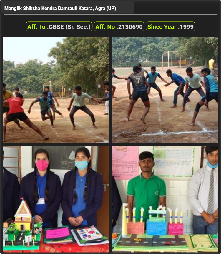 Manglik Shiksha Kendra Bamrauli Katara, Agra (UP), was established in 1999. Manglik Shiksha Kendra Bamrauli Katara, Agra (UP), is up to class Manglik Shiksha Kendra Bamrauli Katara, Agra (UP). Manglik Shiksha Kendra Bamrauli Katara, Agra (UP) is a CBSE (Sr. Sec.) Board school in Fatehabad Rd, Bamrauli Katara, Agra District. Affilication no of this school is 2130690. Currently, Mrs. Sheetal Agarwal is the Head/Principal of Manglik Shiksha Kendra Bamrauli Katara, Agra (UP).This school has courses Nursery, Class 1st (I), Class 2nd(II), Class 3rd (III), Class 4th (IV), Class 5th (V), Class 6th (VI), Class 7th (VII), Class 8th (VIII), Class 9th (IX), Class 10th (X), Class 11th (XI), & Class 12th (XII). Check details of Manglik Shiksha Kendra Bamrauli Katara, Agra (UP) Admission Form 2020, Contact Number (E-Mail/Phone Number), Fee Structure, and Latest Official Notice.