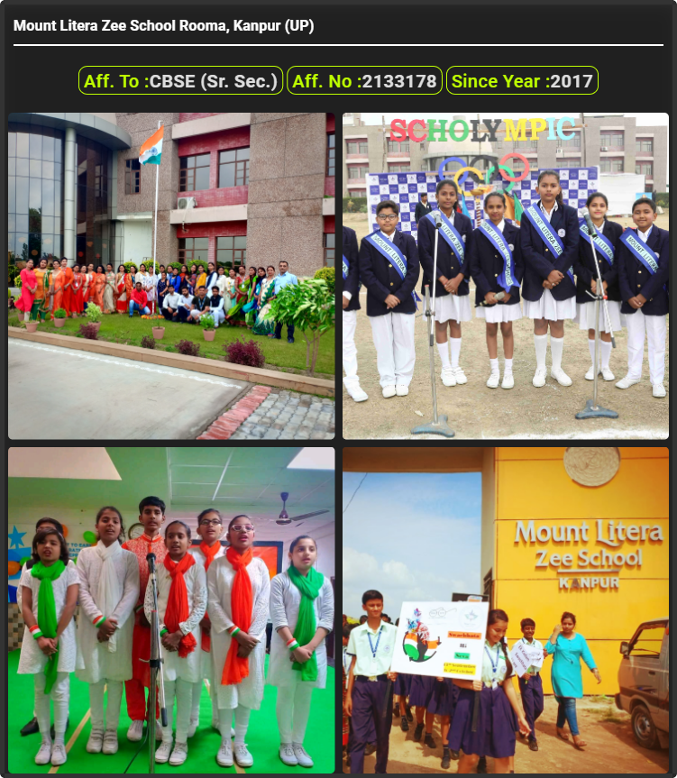 Mount Litera Zee School Rooma, Kanpur (UP), was established in 2017. Mount Litera Zee School Rooma, Kanpur (UP), is up to class Mount Litera Zee School Rooma, Kanpur (UP). Mount Litera Zee School Rooma, Kanpur (UP) is a CBSE (Sr. Sec.) Board school in Rooma, Kanpur Nagar District. Affilication no of this school is 2133178. Currently, Mrs. Suparna Sinha is the Head/Principal of Mount Litera Zee School Rooma, Kanpur (UP).This school has courses Nursery, Lower Kindergarten (LKG), Upper Kindergarten (UKG), Class 1st (I), Class 2nd(II), Class 3rd (III), Class 4th (IV), Class 5th (V), Class 6th (VI), Class 7th (VII), Class 8th (VIII), Class 9th (IX), Class 10th (X), Class 11th (XI) & 12th (XII): Science, Class 11th (XI) & 12th (XII): Art, Class 11th (XI) & 12th (XII): Commerce, . Check details of Mount Litera Zee School Rooma, Kanpur (UP) Admission Form 2020, Contact Number (E-Mail/Phone Number), Fee Structure, and Latest Official Notice.
