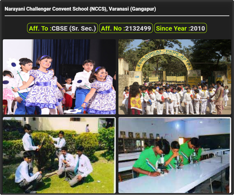 Narayani Challenger Convent School {NCCS}, Varanasi (Gangapur), was established in 2010. Narayani Challenger Convent School {NCCS}, Varanasi (Gangapur), is up to class Narayani Challenger Convent School {NCCS}, Varanasi (Gangapur). Narayani Challenger Convent School {NCCS}, Varanasi (Gangapur) is a CBSE (Sr. Sec.) Board school in Gangapur , Varanasi District. Affiliation no of this school is 2132499. Currently, Mr. Ranjit Singh is the Head/Principal of Narayani Challenger Convent School {NCCS}, Varanasi (Gangapur).This school has courses Nursery, Class 1st (I), Class 2nd(II), Class 3rd (III), Class 4th (IV), Class 5th (V), Class 6th (VI), Class 7th (VII), Class 8th (VIII), Class 9th (IX), Class 10th (X), Class 11th (XI) & Class 12th (XII). Check details of Narayani Challenger Convent School {NCCS}, Varanasi (Gangapur) Admission Form 2022-23, Contact Number (E-Mail/Phone Number), Fee Structure, and Latest Official Notice.