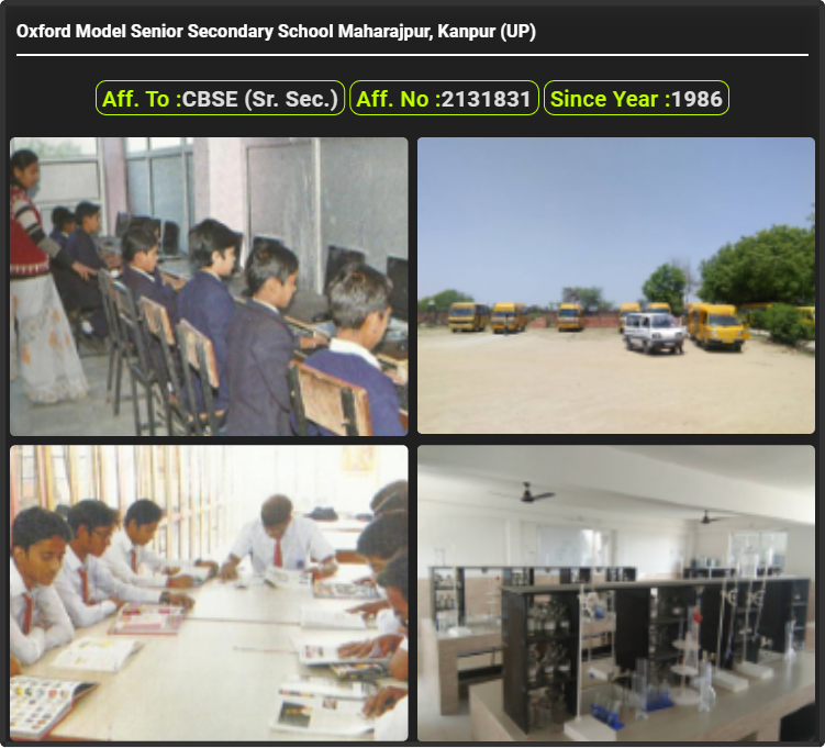 Oxford Model Senior Secondary School Maharajpur, Kanpur (UP), was established in 1986. Oxford Model Senior Secondary School Maharajpur, Kanpur (UP), is up to class Oxford Model Senior Secondary School Maharajpur, Kanpur (UP). Oxford Model Senior Secondary School Maharajpur, Kanpur (UP) is a CBSE (Sr. Sec.) Board school in Maharajpur, Kanpur Nagar District. Affiliation no of this school is 2131831. Currently, Dr. Manju Singh is the Head/Principal of Oxford Model Senior Secondary School Maharajpur, Kanpur (UP).This school has courses Class 1st (I), Class 2nd(II), Class 3rd (III), Class 4th (IV), Class 5th (V), Class 6th (VI), Class 7th (VII), Class 8th (VIII), Class 9th (IX), Class 10th (X), Class 11th (XI), Class 12th (XII). Check details of Oxford Model Senior Secondary School Maharajpur, Kanpur (UP) Admission Form -(Based on Previous Year), Contact Number (E-Mail/Phone Number), Fee Structure, and Latest Official Notice.