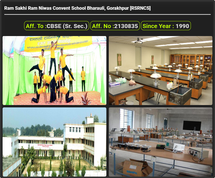 Ram Sakhi Ram Niwas Convent School Bharauli, Gorakhpur [RSRNCS], was established in 1990 Ram Sakhi Ram Niwas Convent School Bharauli, Gorakhpur [RSRNCS], is up to class Ram Sakhi Ram Niwas Convent School Bharauli, Gorakhpur [RSRNCS]. Ram Sakhi Ram Niwas Convent School Bharauli, Gorakhpur [RSRNCS] is a CBSE (Sr. Sec.) Board school in Bharauli, Gorakhpur District. Affiliation no of this school is 2130835. Currently, Mr. Vishnu Pratap Shukla is the Head/Principal of Ram Sakhi Ram Niwas Convent School Bharauli, Gorakhpur [RSRNCS].This school has courses Class 1st (I), Class 2nd(II), Class 3rd (III), Class 4th (IV), Class 5th (V), Class 6th (VI), Class 7th (VII), Class 8th (VIII), Class 9th (IX), Class 10th (X), Class 11th (XI) & Class 12th (XII). Check details of Ram Sakhi Ram Niwas Convent School Bharauli, Gorakhpur [RSRNCS] Admission Form -(Based on Previous Year), Contact Number (E-Mail/Phone Number), Fee Structure, and Latest Official Notice.