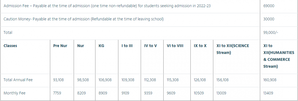 Note: Please contact school or visit official site for updated fee structure for year 2023- 2024.