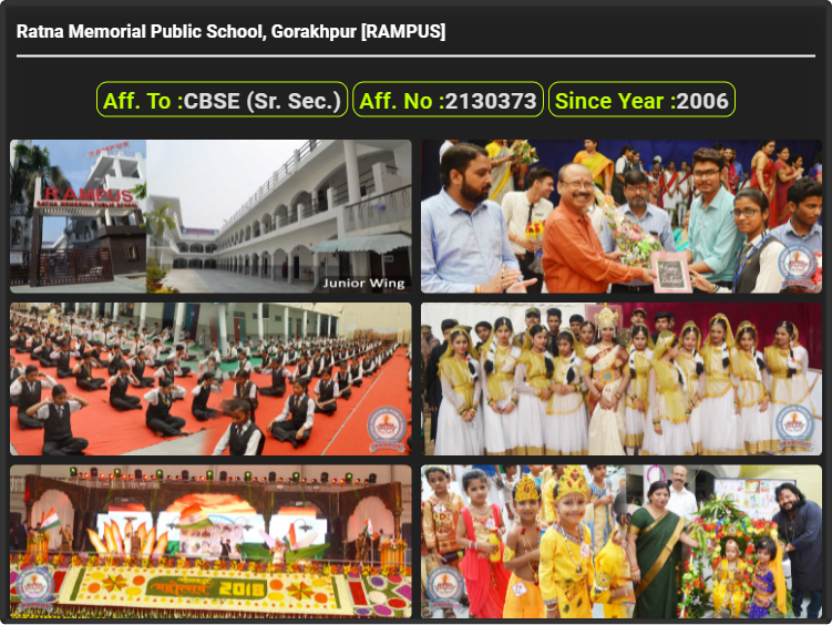 Ratna Memorial Public School, Gorakhpur [RAMPUS], was established in 2006 Ratna Memorial Public School, Gorakhpur [RAMPUS], is up to class Ratna Memorial Public School, Gorakhpur [RAMPUS]. Ratna Memorial Public School, Gorakhpur [RAMPUS] is a CBSE (Sr. Sec.) Board school in Arogya Mandir, Gorakhpur District. Affiliation no of this school is 2130373. Currently, Mr. Raj Kumar Srivastava is the Head/Principal of Ratna Memorial Public School, Gorakhpur [RAMPUS].This school has courses Class Play Way, Class LKG, Class UKG, Class 1st (I), Class 2nd(II), Class 3rd (III), Class 4th (IV), Class 5th (V), Class 6th (VI), Class 7th (VII), Class 8th (VIII), Class 9th (IX), Class 10th (X), Class 11th (XI) & Class 12th (XII). Check details of Ratna Memorial Public School, Gorakhpur [RAMPUS] Admission Form -(Based on Previous Year), Contact Number (E-Mail/Phone Number), Fee Structure, and Latest Official Notice.