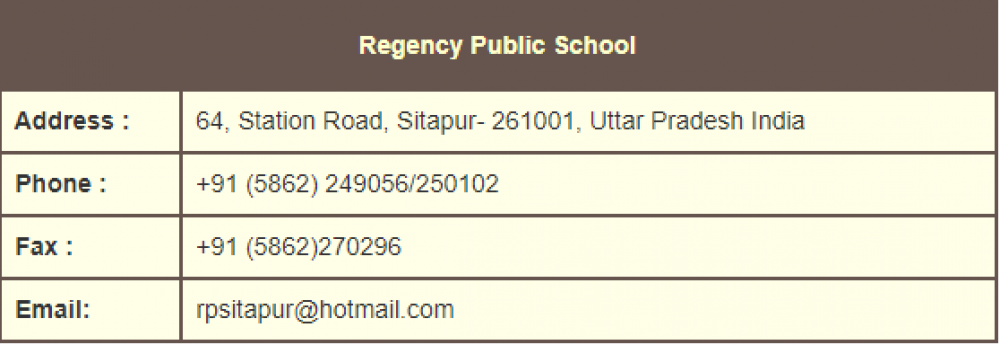 Regency Public School, Sitapur (रीजेंसी पब्लिक स्कूल, सीतापुर) , was established in RPS, Sitapur , is up to class RPS, Sitapur . Regency Public School, 64, Station Road is a ICSE & ISC Board school in 64, Station Road, Sitapur District. Affilication no of this school is UP177. Currently, Mrs. R. ZAIDI is the Head/Principal of Regency Public School, 64, Station Road .This school has courses Class LKG, Class UKG, Class I, Class II, Class III, Class IV, Class V, Class VI, Class VII, Class VIII, Class IX, Class X, Class XI, Class XII, . Check details of Regency Public School, Sitapur (रीजेंसी पब्लिक स्कूल, सीतापुर) Admission Form -(Based on Previous Year), Contact Number (E-Mail/Phone Number), Fee Structure, and Latest Official Notice.