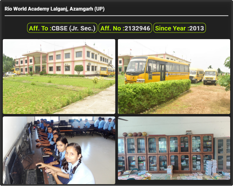 Rio World Academy Lalganj, Azamgarh (UP), was established in 2013. Rio World Academy Lalganj, Azamgarh (UP), is up to class Rio World Academy Lalganj, Azamgarh (UP). Rio World Academy Lalganj, Azamgarh (UP) is a CBSE (Jr. Sec.) Board school in Lalganj, Azamgarh District. Affilication no of this school is 2132946. Currently, Dr. Renu Singh is the Head/Principal of Rio World Academy Lalganj, Azamgarh (UP).This school has courses Class 1st (I), Class 2nd(II), Class 3rd (III), Class 4th (IV), Class 5th (V), Class 6th (VI), Class 7th (VII), Class 8th (VIII), Class 9th (IX), & Class 10th (X). Check details of Rio World Academy Lalganj, Azamgarh (UP) Admission Form 2020, Contact Number (E-Mail/Phone Number), Fee Structure, and Latest Official Notice.