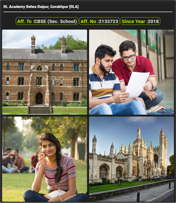 RL Academy Belwa Raipur, Gorakhpur [RLA], was established in 2018 RL Academy Belwa Raipur, Gorakhpur [RLA], is up to class RL Academy Belwa Raipur, Gorakhpur [RLA]. RL Academy Belwa Raipur, Gorakhpur [RLA] is a CBSE (Sec. School) Board school in Belwa Raipur, Gorakhpur District. Affiliation no of this school is 2133723. Currently, Mr. Dharmendra Kumar Yadav is the Head/Principal of RL Academy Belwa Raipur, Gorakhpur [RLA].This school has courses Class Play way, Class Nursery, Class 1st (I), Class 2nd(II), Class 3rd (III), Class 4th (IV), Class 5th (V), Class 6th (VI), Class 7th (VII), Class 8th (VIII), Class 9th (IX) & Class 10th (X). Check details of RL Academy Belwa Raipur, Gorakhpur [RLA] Admission Form -(Based on Previous Year), Contact Number (E-Mail/Phone Number), Fee Structure, and Latest Official Notice.