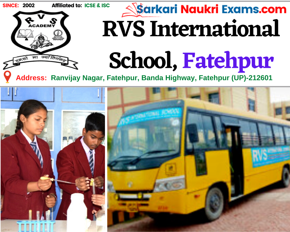 RVS International School, Fatehpur (आरवीएस इंटरनेशनल स्कूल, फतेहपुर) , was established in 2002 RVSIS, Fatehpur , is up to class RVSIS, Fatehpur . RVS International School, Ranvijay Nagar, Fatehpur is a ICSE & ISC Board school in Ranvijay Nagar, Banda Highway , Fatehpur District. Affilication no of this school is UP337. Currently, Mrs. Geeta Sahab Chandni is the Head/Principal of RVS International School, Ranvijay Nagar, Fatehpur .This school has courses Nur. & U.K.G., Class I, Class II, Class III, Class IV, Class V, Class VI, Class VII, Class VIII, Class IX, Class X, Class XI, Class XII, . Check details of RVS International School, Fatehpur (आरवीएस इंटरनेशनल स्कूल, फतेहपुर) Admission Form , Contact Number (E-Mail/Phone Number), Fee Structure, and Latest Official Notice.