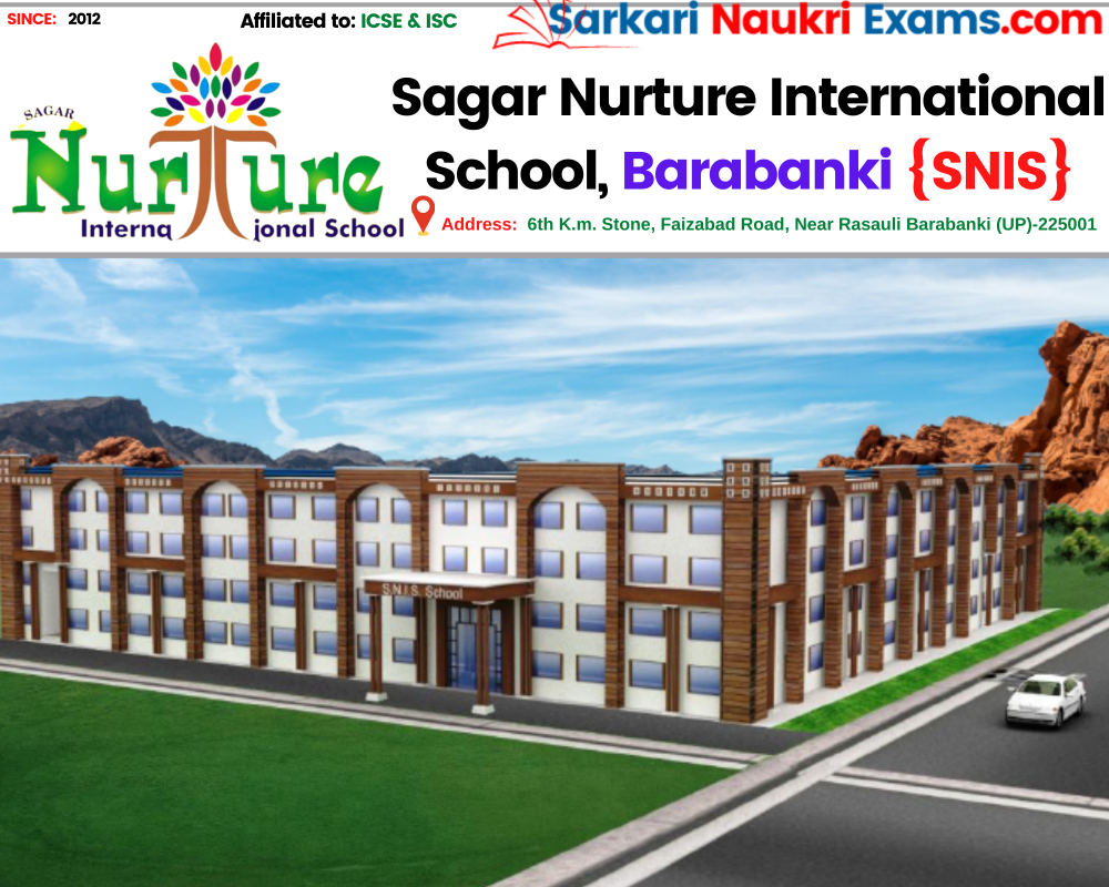 Sagar Nurture International School, Barabanki (सागर नर्चर इंटरनेशनल स्कूल, बाराबंकी) , was established in 2012 SNIS, Barabanki , is up to class SNIS, Barabanki . Sagar Nurture International School, Faizabad Road, Near Rasauli Barabanki-225001 in Uttar Pradesh is a ICSE & ISC Board school in Faizabad Road, Near Rasauli, Barabanki District. Affilication no of this school is UP362. Currently, Mr. Ajay Kumar Mishra is the Head/Principal of Sagar Nurture International School, Faizabad Road, Near Rasauli Barabanki-225001 in Uttar Pradesh .This school has courses LKG & UKG, Class I, Class II, Class III, Class IV, Class V, Class VI, Class VII, Class VIII, Class IX, Class X, Class XI, Class XII, . Check details of Sagar Nurture International School, Barabanki (सागर नर्चर इंटरनेशनल स्कूल, बाराबंकी) Admission Form , Contact Number (E-Mail/Phone Number), Fee Structure, and Latest Official Notice.