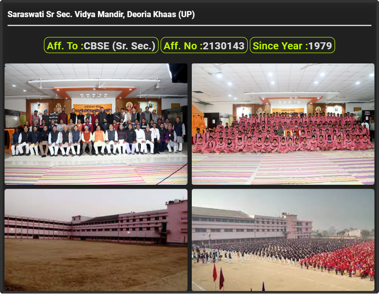 Saraswati Sr. Sec. Vidya Mandir, Deoria Khaas (UP), was established in 1979. Saraswati Sr Sec. Vidya Mandir, Deoria Khaas (UP), is up to class Saraswati Sr Sec. Vidya Mandir, Deoria Khaas (UP). Saraswati Sr. Sec. Vidya Mandir, Deoria Khaas (UP) is a CBSE (Sr. Sec.) Board school in Deoria Khaas, Deoria District. Affilication no of this school is 2130143. Currently, Shravan Singh is the Head/Principal of Saraswati Sr. Sec. Vidya Mandir, Deoria Khaas (UP).This school has courses Class 1st (I), Class 2nd(II), Class 3rd (III), Class 4th (IV), Class 5th (V), Class 6th (VI), Class 7th (VII), Class 8th (VIII), Class 9th (IX), Class 10th (X), Class 11th (XI) & Class 12th (XII). Check details of Saraswati Sr Sec. Vidya Mandir, Deoria Khaas (UP) Admission Form 2020, Contact Number (E-Mail/Phone Number), Fee Structure, and Latest Official Notice.