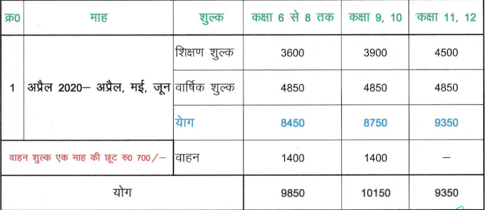 Get fee details about admission, Tuition fee and transort fee and other fee details.