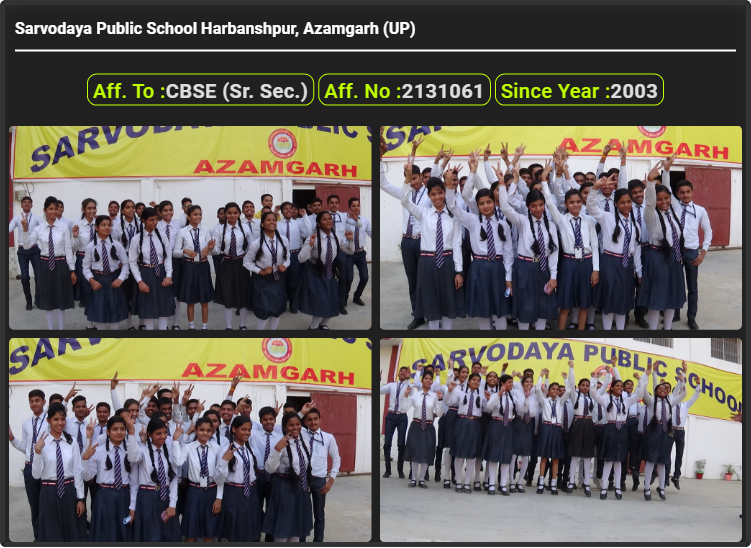 Sarvodaya Public School Harbanshpur, Azamgarh (UP), was established in 2003. Sarvodaya Public School Harbanshpur, Azamgarh (UP), is up to class Sarvodaya Public School Harbanshpur, Azamgarh (UP). Sarvodaya Public School Harbanshpur, Azamgarh (UP) is a CBSE (Sr. Sec.) Board school in Harbanshpur, Azamgarh District. Affilication no of this school is 2131061. Currently, Ram Ashis Upadhyay is the Head/Principal of Sarvodaya Public School Harbanshpur, Azamgarh (UP).This school has courses Class 1st (I), Class 2nd(II), Class 3rd (III), Class 4th (IV), Class 5th (V), Class 6th (VI), Class 7th (VII), Class 8th (VIII), Class 9th (IX), Class 10th (X), Class 11th (XI), & Class 12th (XII). Check details of Sarvodaya Public School Harbanshpur, Azamgarh (UP) Admission Form 2020, Contact Number (E-Mail/Phone Number), Fee Structure, and Latest Official Notice.