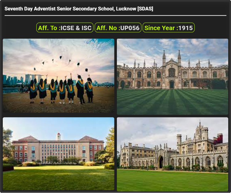 Seventh Day Adventist Senior Secondary School, Lucknow [SDAS], was established in 1915. Seventh Day Adventist Senior Secondary School, Lucknow [SDAS], is up to class Seventh Day Adventist Senior Secondary School, Lucknow [SDAS]. Seventh Day Adventist Senior Secondary School, Lucknow [SDAS] is a ICSE & ISC Board school in 17, Vidhan Sabha Marg, Lucknow District. Affiliation no of this school is UP056. Currently, R. Durairaj is the Head/Principal of Seventh Day Adventist Senior Secondary School, Lucknow [SDAS].This school has courses Class Nursery & K.G., Class I, Class II, Class III, Class IV, Class V, Class VI, Class VII, Class VIII, Class IX, Class X, Class XI, Class XII, . Check details of Seventh Day Adventist Senior Secondary School, Lucknow [SDAS] Admission Form 2022-23, Contact Number (E-Mail/Phone Number), Fee Structure, and Latest Official Notice.