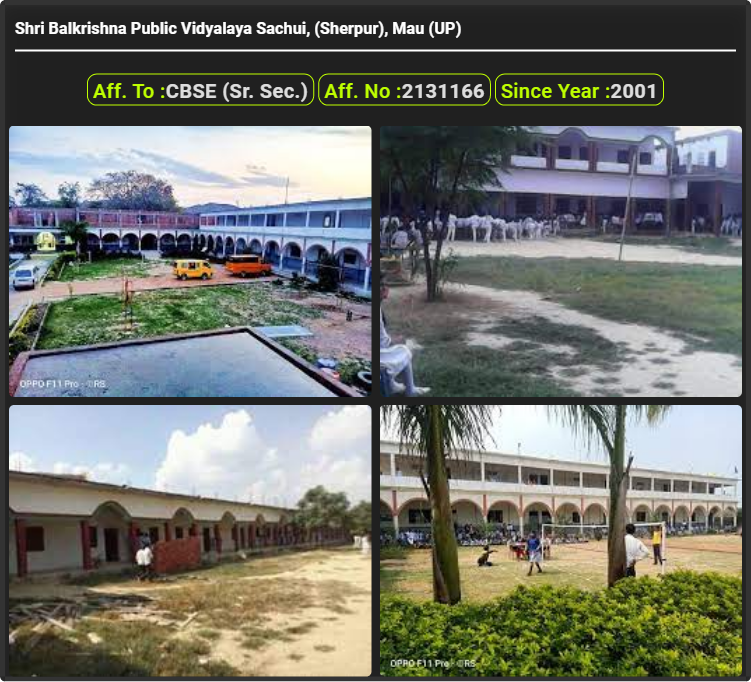 Shri Balkrishna Public Vidyalaya Sachui, (Sherpur), Mau (UP), was established in 2001. Shri Balkrishna Public Vidyalaya Sachui, (Sherpur), Mau (UP), is up to class Shri Balkrishna Public Vidyalaya Sachui, (Sherpur), Mau (UP). Shri Balkrishna Public Vidyalaya Sachui, (Sherpur), Mau (UP) is a CBSE (Sr. Sec.) Board school in Sachui (Sherpur), Mau District. Affilication no of this school is 2131166. Currently, Santosh Kumar Yadav is the Head/Principal of Shri Balkrishna Public Vidyalaya Sachui, (Sherpur), Mau (UP).This school has courses Nursery, Class 1st (I), Class 2nd(II), Class 3rd (III), Class 4th (IV), Class 5th (V), Class 6th (VI), Class 7th (VII), Class 8th (VIII), Class 9th (IX), Class 10th (X), Class 11th (XI), & Class 12th (XII). Check details of Shri Balkrishna Public Vidyalaya Sachui, (Sherpur), Mau (UP) Admission Form 2020, Contact Number (E-Mail/Phone Number), Fee Structure, and Latest Official Notice.
