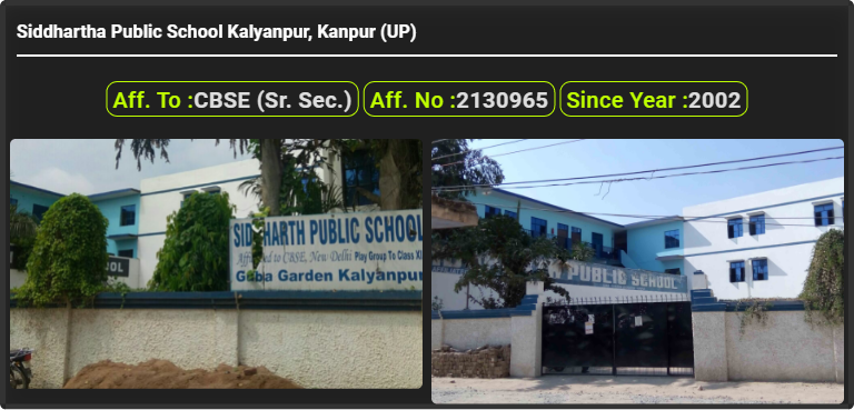 Siddhartha Public School Kalyanpur, Kanpur (UP), was established in 2002. Siddhartha Public School Kalyanpur, Kanpur (UP), is up to class Siddhartha Public School Kalyanpur, Kanpur (UP). Siddhartha Public School Kalyanpur, Kanpur (UP) is a CBSE (Sr. Sec.) Board school in Kalyanpur, Kanpur Nagar District. Affilication no of this school is 2130965. Currently, Jyotsna Pandey is the Head/Principal of Siddhartha Public School Kalyanpur, Kanpur (UP).This school has courses Nursery, Kindergarten (KG), Lower Kindergarten (LKG), Class 1st (I), Class 2nd(II), Class 3rd (III), Class 4th (IV), Class 5th (V), Class 6th (VI), Class 7th (VII), Class 8th (VIII), Class 9th (IX), Class 10th (X), Class 11th (XI), Class 12th (XII). Check details of Siddhartha Public School Kalyanpur, Kanpur (UP) Admission Form 2020, Contact Number (E-Mail/Phone Number), Fee Structure, and Latest Official Notice.