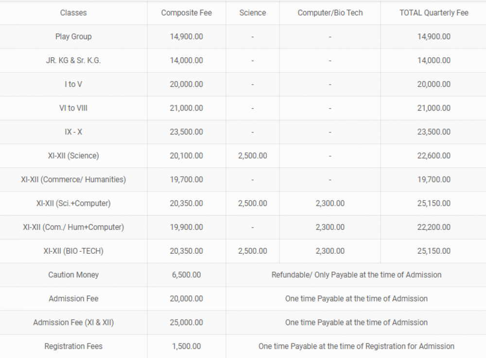 Admission fee (Class XI & XII):- Rs.- 25000/- | Registration fee (One Time):- Rs.- 1500/-